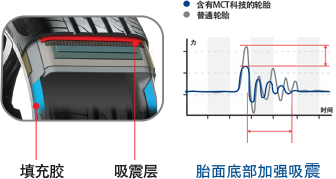 优化胎侧填充胶硬度,弹性更好,大幅度吸收震当车辆通过减速带、水泥路接缝、粗糙路面等情况时,MCT技术让其冲击、颠簸感大幅减小动,厚度加大,冲击力有效分散,震动感减弱,提高舒适性